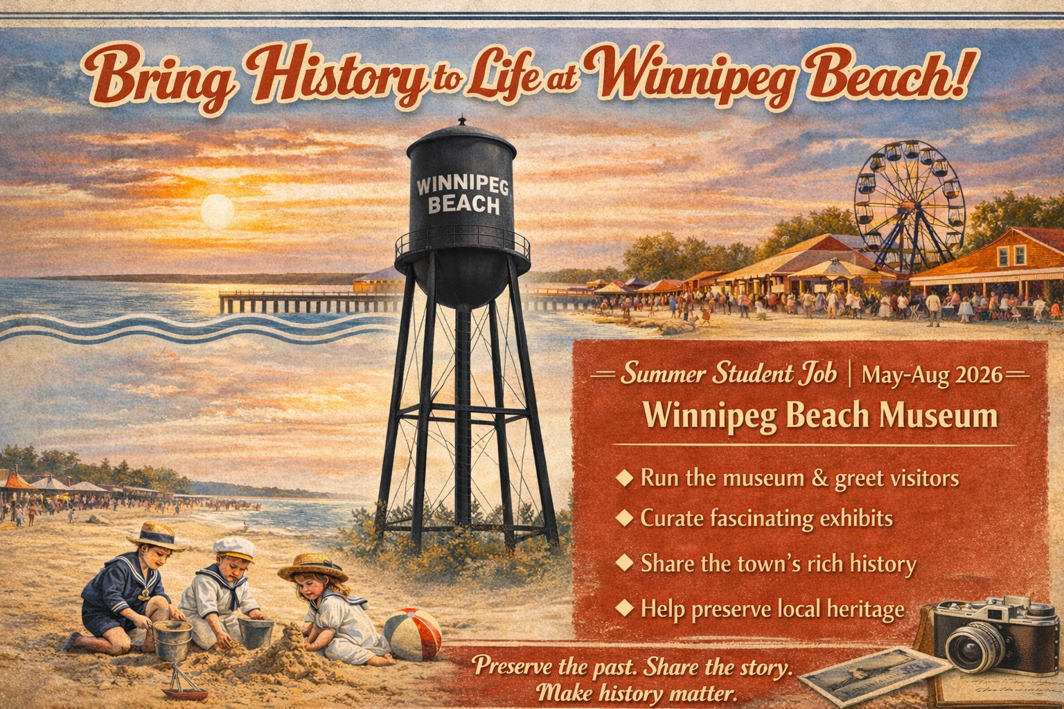 The Winnipeg Beach Historical Society is seeking an enthusiastic and responsible student to join our small team for the 2026 summer season. This grant-funded position offers a unique opportunity to gain hands-on experience in museum operations, local history research, public programming, digital communications, and community engagement in the beautiful Interlake resort community of Winnipeg Beach.